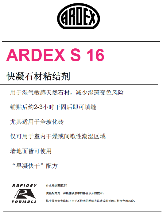 使用ARDEX S 16 粘貼瓷磚和馬賽克在常 溫下2小時(shí)后即可填縫作業(yè)和上人。尤其適 用于粘結(jié)床需要快干或粘貼后短時(shí)內(nèi)需要 填縫投入使用的情況。