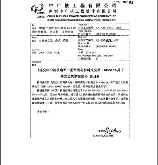 熱烈慶祝我司中標(biāo)紅沿河核電德固賽硅烷